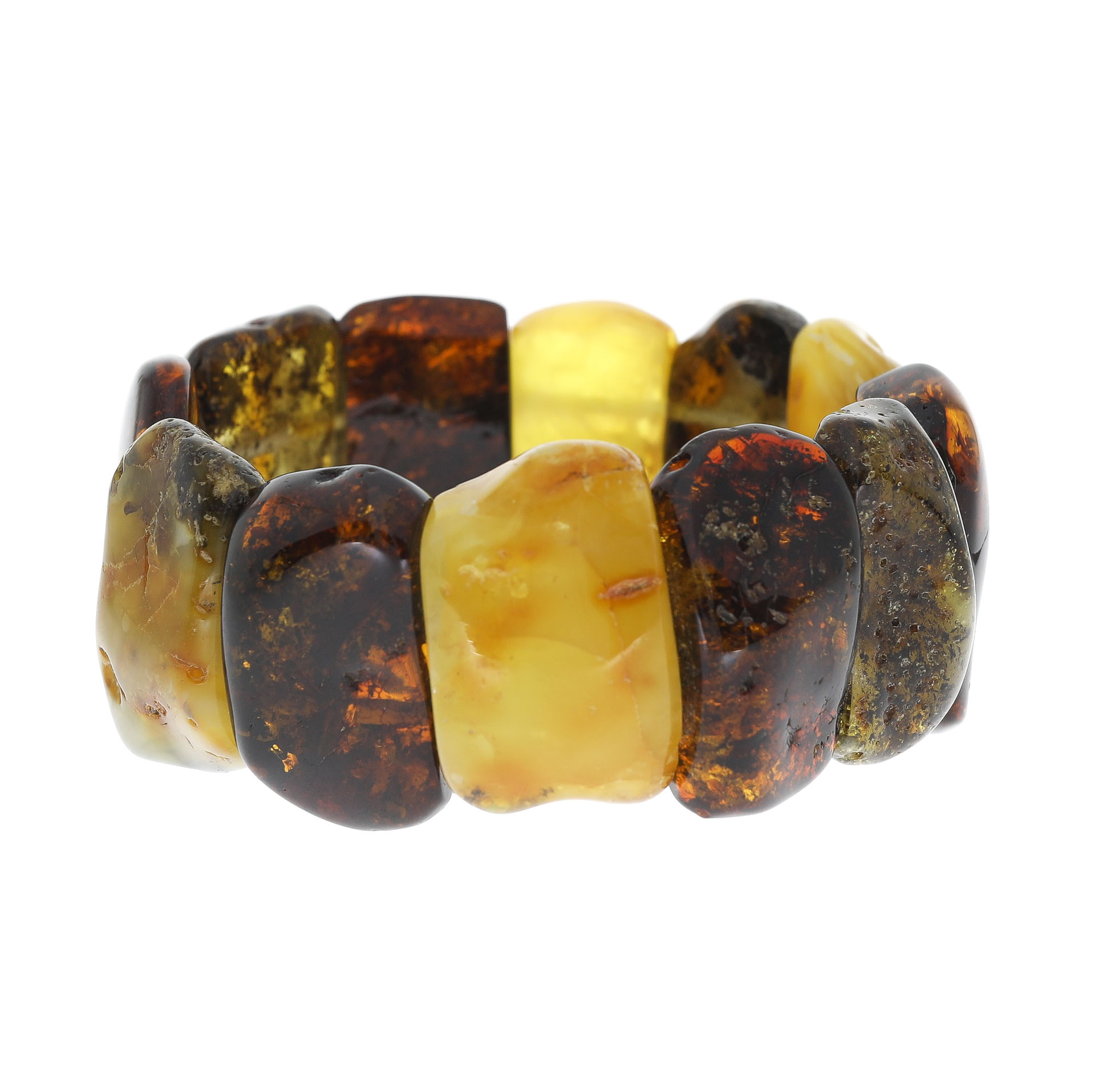 Das Armband besteht aus leicht polierten, verschiedenfarbigen Bernsteinstücken, die so zusammengesetzt sind, dass ein einzigartiges Spiel und ein Kontrast zwischen dunklem und hellem Bernstein entsteht.