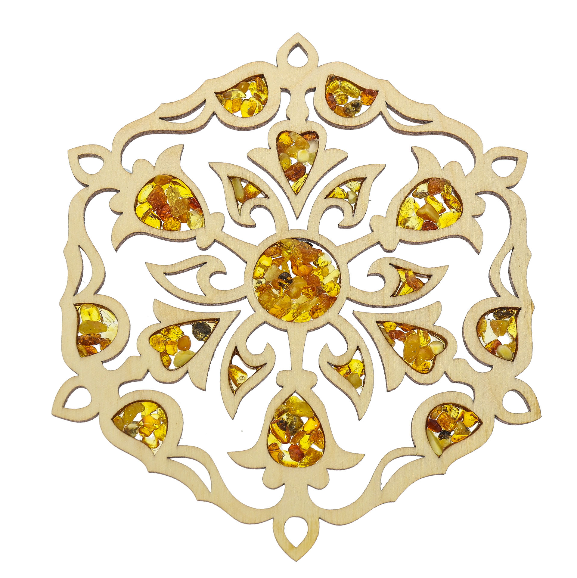 Schneeflocken-Mandala aus Bernstein und Holz