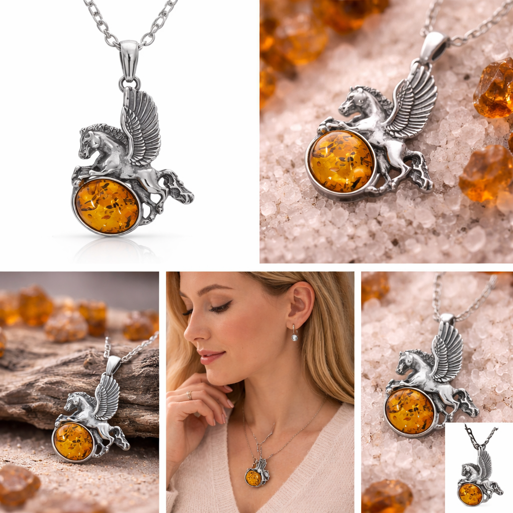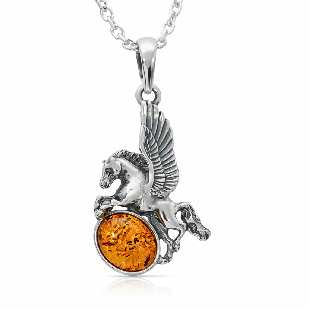 Steigen Sie mit diesem exquisiten Pegasus-Anhänger mit Flügeln in die Welt der Legenden auf. Dieses Schmuckstück ist meisterhaft aus hochwertigem 925er Sterlingsilber gefertigt und stellt einen majestätischen Pegasus in voller Fahrt dar, dessen Hufe auf einer strahlenden Kugel aus echtem Bernstein ruhen. Das Silber wurde sorgfältig oxidiert, um einen „Vintage”- oder „Antik”-Look zu erzielen, der jede einzelne Feder der Flügel und die kraftvollen Muskeln des mythischen Hengstes hervorhebt.