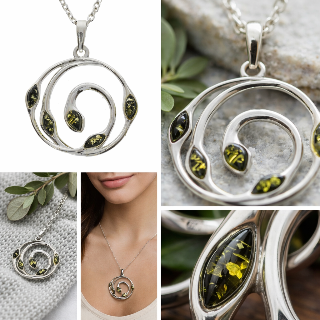 Grüner Bernsteinanhänger, Sterlingsilberschmuck, baltische Bernsteinkette, naturinspirierter Schmuck, handgefertigter Silberanhänger, botanischer Schmuck, Edelsteingeschenk für sie.
