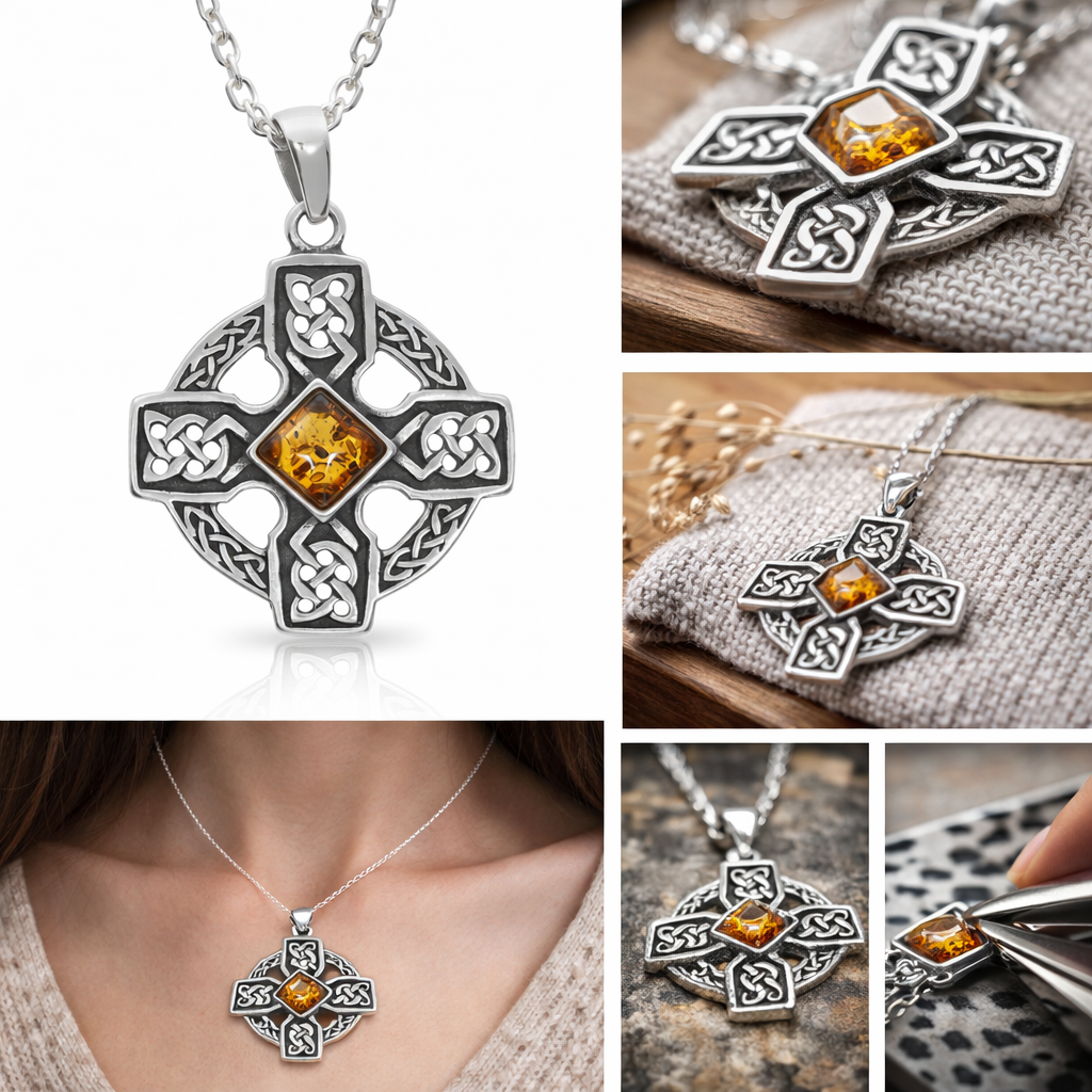 Ehren Sie die Tradition mit diesem atemberaubenden keltischen Hochkreuz-Anhänger. Dieses meisterhaft gefertigte Schmuckstück zeigt das ikonische kreisförmige Rad und die endlosen Knotenmuster, die für das irische Erbe stehen. Ein einzigartiger, quadratisch geschliffener Cognac-Bernstein aus dem Baltikum ist an der Kreuzung eingebettet und fängt mit seinen natürlichen Einschlüssen das Licht ein. Dieser Anhänger aus hochglanzpoliertem 925er Sterlingsilber ist eine wunderschöne Verschmelzung von Glauben, Geschichte und der organischen Schönheit von altem Bernstein.