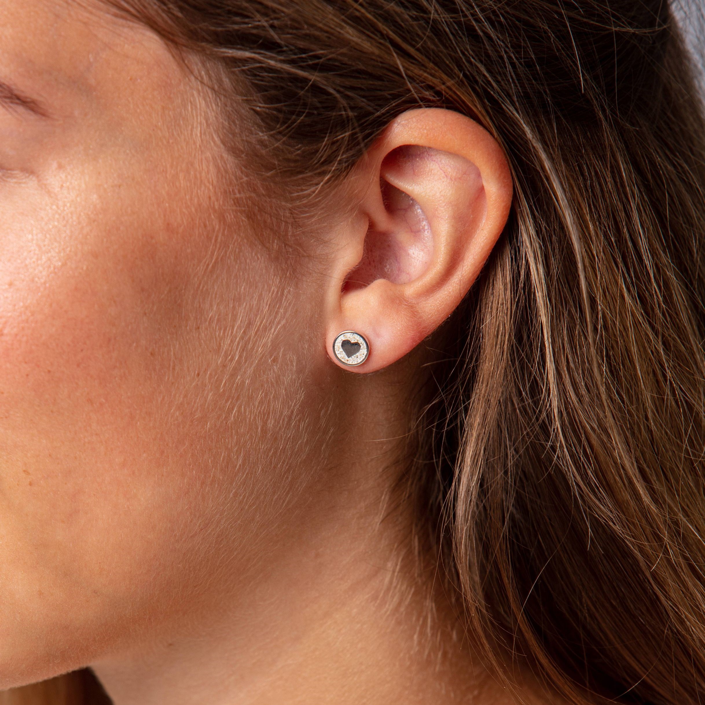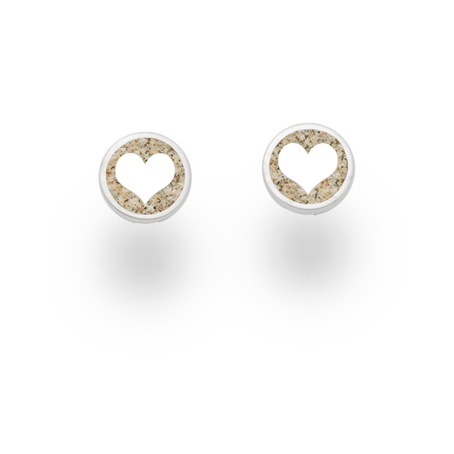 Ohrring "Herz", kleiner runder Ohrstecker mit einem in Strandsand eingebetteten Herz, gefaßt in rhodiniertem 925er Sterlingsilber.