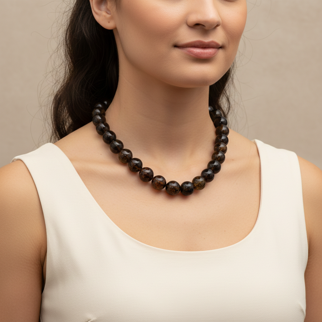 Verleihen Sie Ihrem Look Charakter mit dieser einzigartigen Bernsteinkette, die nordischen Minimalismus mit der rohen Eleganz der Natur verbindet. Die Kette besteht aus sorgfältig ausgewählten, polierten Perlen aus schwarzem Bernstein (auch bekannt als schwarzes Gold), von denen jede einzelne Millionen Jahre Geschichte in sich trägt.